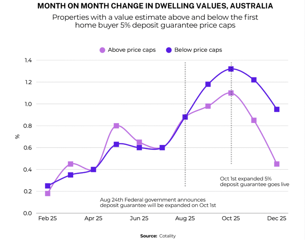 Since the federal government expanded the 5% Deposit Scheme in October 2025, Cotality analysis shows homes under the scheme’s price caps have generally outperformed homes above them. In the December quarter, median prices rose 3.6% under the cap versus 2.4% above the cap.