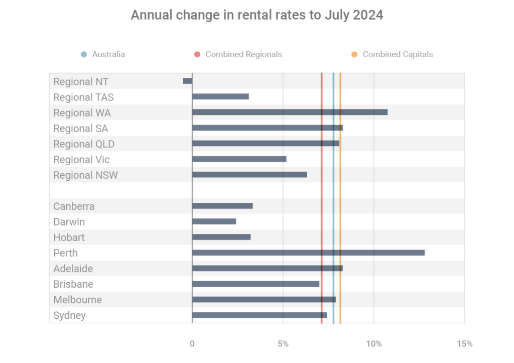 Between February and July, rental growth fell from 9.7% to 8.0% in the combined capitals, although it rose from 5.4% to 7.1% in the combined regions. The big cities appear to be close to their rental affordability limit, while the regions, which have had less rental growth, might have more capacity to absorb higher rents.